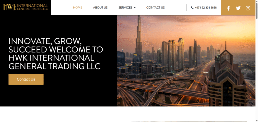 A Dubai‑based general‑trading and business‑services website offering a wide range of services including business consulting, import/export, product development, supply‑chain solutions, wholesale distribution, food & beverage wholesale, and bridge financing — all presented in a clean, professional layout for global clients.